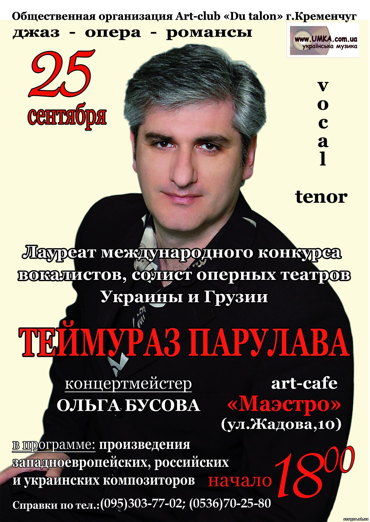Art-club"DU TALON" приглашает на вечер джаза, оперы и романсов. Гость вечера:Лауреат международного конкурса вокалистов, солист оперных театров Украины и Грузии - ТЕЙМУРАЗ ПАРУЛАВА. 25 сентября в 18.00 ,г.Кременчуг,арт-кафе"МАЭСТРО"(ул.Жадова,10) Тел. 095 303 77 02; (0536) 702580