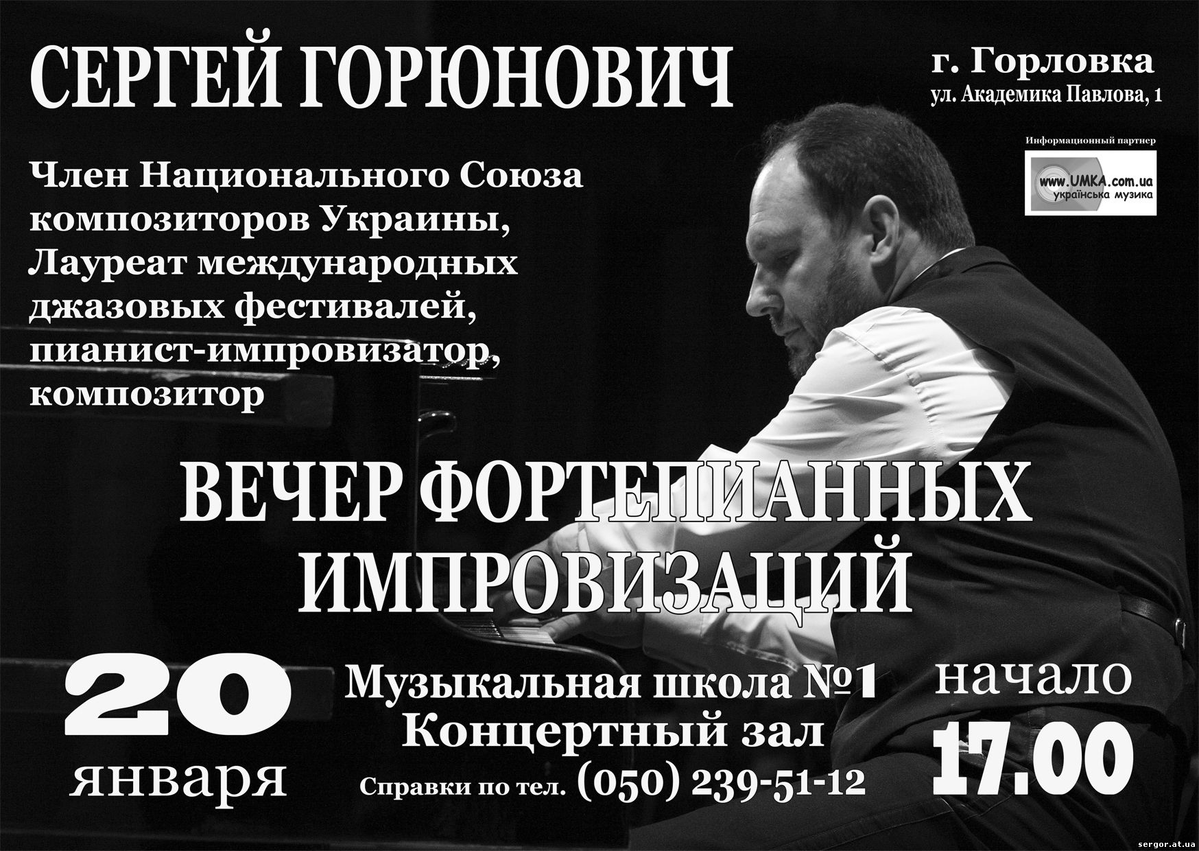 20 ноября 2010 г.в 18.00 состоится Творческий вечер члена Национального Союза композиторов Украины, лауреата международных джазовых фестивалей, пианиста-импровизатора, композитора Сергея Горюновича. г.Кременчуг, ГДК, б-р Пушкина,2, концертный зал. Тел. (095)303-77-02; (0536)70-25-80. Гости вечера: Игорь Гныдин (ударные, Львов), Юрий Яремчук (саксофоны, кларнет, Львов), Ольга Войченко(вокал, Киев), Татьяна Полищук (рояль, Черкассы), Александр Жуков (контрабас, Полтава), Теймураз Парулава (тенор, солист оперных театров Украины и Грузии), хоровой ансамбль "Элегия" Людмилы Ломоносовой, джаз-квинтет "Du talon". Выставка художников и фото-художников. В программе концерта: джазовые импровизации, сочинения для фортепиано, хоры a cappella, инструментальные композиции, хоровые произведения в сопровождении фортепиано, обработки украинских народных песен, аранжировки джазовых стандартов, электронная музыка. 21 ноября 2010 г. в 18.00 состоится jam-session. г.Кременчуг, отель "Днепровские зори", ул.Халаменюка,8. Yegres
