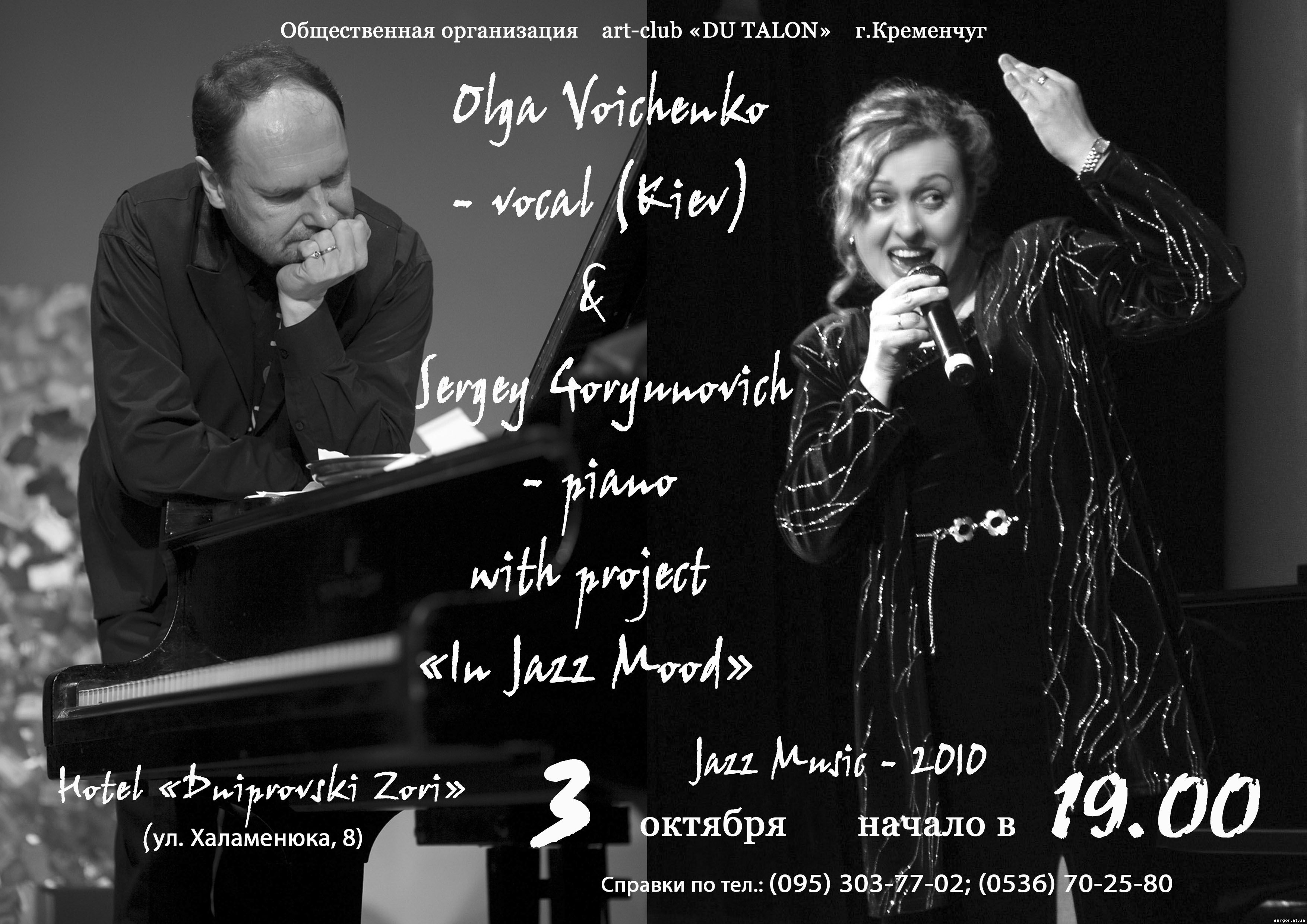 3 октября 2010 года, начало в 19.00, готель"Днепровские зори", г.Кременчуг, ул.Халаменюка, 8 (1 этаж). Вечер джазовой и импровизационной музыки. Jazz-club "Du talon" представляет: Ольга Войченко (vocal, Киев) и Сергей Горюнович (piano, Кременчуг) с проектом "In Jazz Mood". Ольга Войченко - вокалистка, Лауреат многочисленных международных джазовых фестивалей, обладатель ГРАН-ПРИ джазового конкурса (вокал) - (Токио,Япония). Маршруты гастролей: Англия, Польща, Япония, Россия, Финляндия, Германия, Франция, Украина и др.